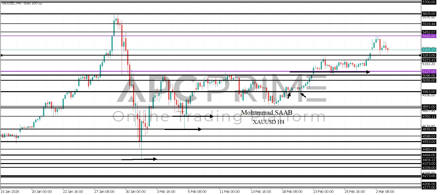 المنطقة الأهم (5263) ثبات السعر أعلى المنطقة الأهم يتجه السعر إلى منطقة المقاومة (5420) احتمالية الارتداد منها ممكنة ولكن باختراقها وإغلاق أعلى بشمعة أربع ساعات يتجه السعر إلى منطقة المقاومة (5452)