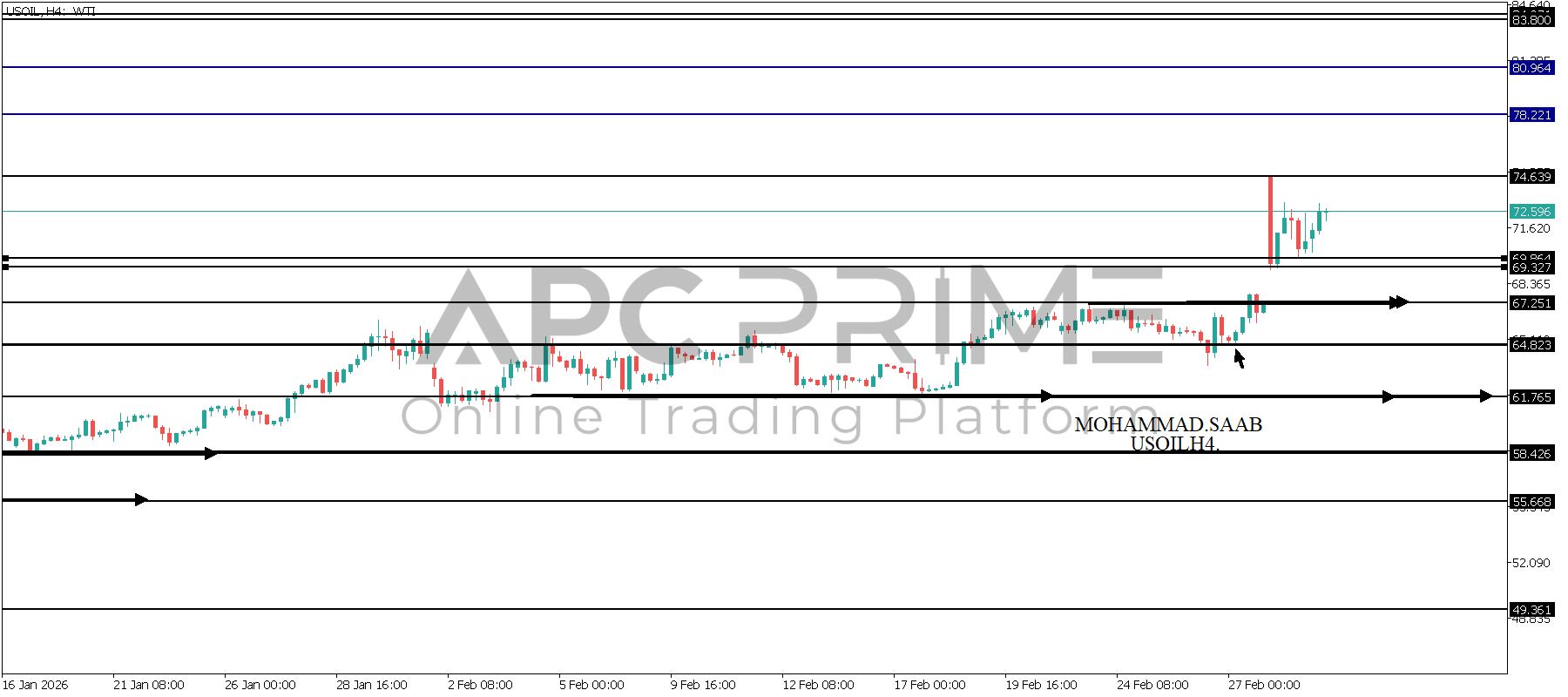 المنطقة الأهم (69.864) ثبات السعر أعلى المنطقة الأهم يتجه السعر إلى منطقة المقاومة (74.639) احتمالية الارتداد منها ممكنة ولكن باختراقها وإغلاق أعلى بشمعة أربع ساعات يتجه السعر إلى منطقة المقاومة (78.221)
