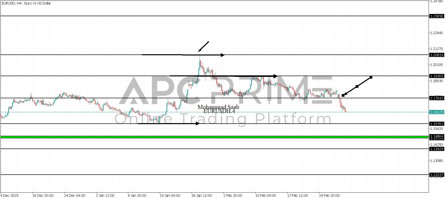 المنطقة الأهم (1.17643) ثبات السعر أسفل المنطقة الأهم يتجه السعر إلى منطقة الدعم (1.15761) احتمالية الارتداد منها ممكنة ولكن بكسرها وإغلاق أسفل بشمعة أربع ساعات يتجه السعر إلى منطقة الدعم (1.14864-1.14764)