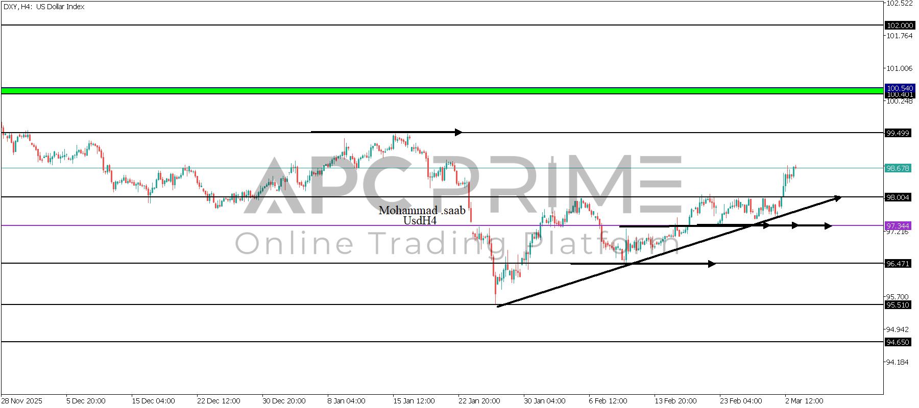 المنطقة الأهم (98.004) ثبات السعر أعلى المنطقة الأهم يتجه السعر إلى منطقة المقاومة (99.499) احتمالية الارتداد منها ممكنة ولكن باختراقها وإغلاق أعلى بشمعة أربع ساعات يتجه السعر إلى منطقة المقاومة (100.401-100.540) السيناريو البديل لتحليل مؤشر الدولار