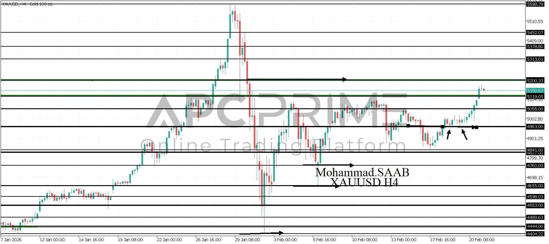 المنطقة الأهم (5119) ثبات السعر أعلى المنطقة الأهم يتجه السعر إلى منطقة المقاومة (5200) احتمالية الارتداد منها ممكنة ولكن باختراقها وإغلاق أعلى بشمعة أربع ساعات يتجه السعر إلى منطقة المقاومة (5313)
