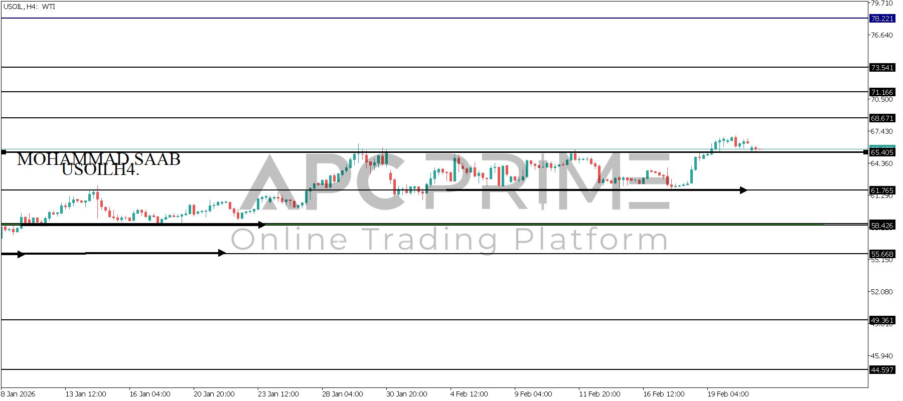 المنطقة الأهم (65.405) ثبات السعر أعلى المنطقة الأهم يتجه السعر إلى منطقة المقاومة (68.671) احتمالية الارتداد منها ممكنة ولكن باختراقها وإغلاق أعلى بشمعة أربع ساعات يتجه السعر إلى منطقة المقاومة (71.166)