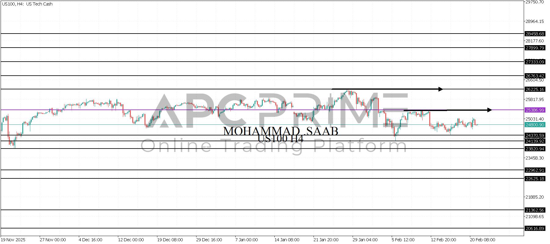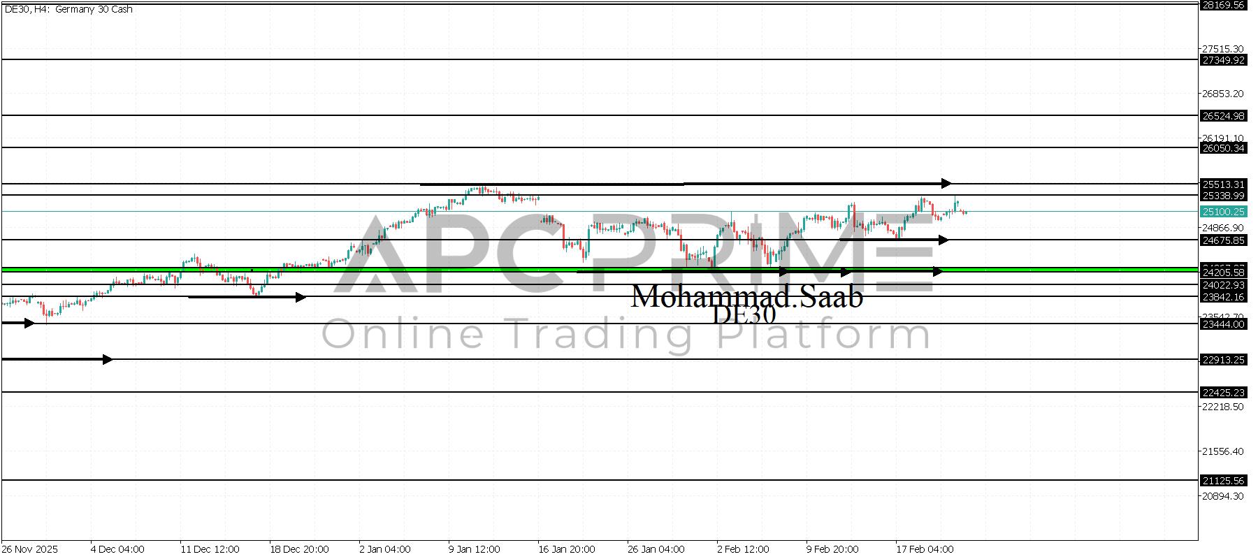 المنطقة الأهم (24675) ثبات السعر أعلى المنطقة الأهم يتجه السعر إلى منطقة المقاومة (25338) احتمالية الارتداد منها ممكنة ولكن باختراقها وإغلاق أعلى بشمعة أربع ساعات يتجه السعر إلى منطقة المقاومة (25513)