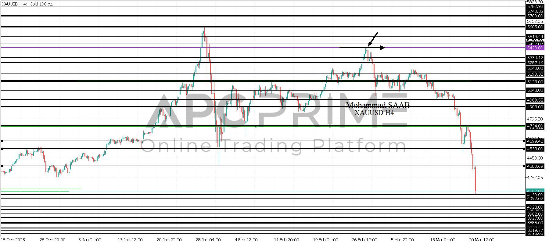 المنطقة الأهم (4380) ثبات السعر أسفل المنطقة الأهم يتجه السعر إلى منطقة الدعم (4130) احتمالية الارتداد منها ممكنة ولكن بكسرها وإغلاق أسفل بشمعة أربع ساعات يتجه السعر إلى منطقة الدعم (4097)