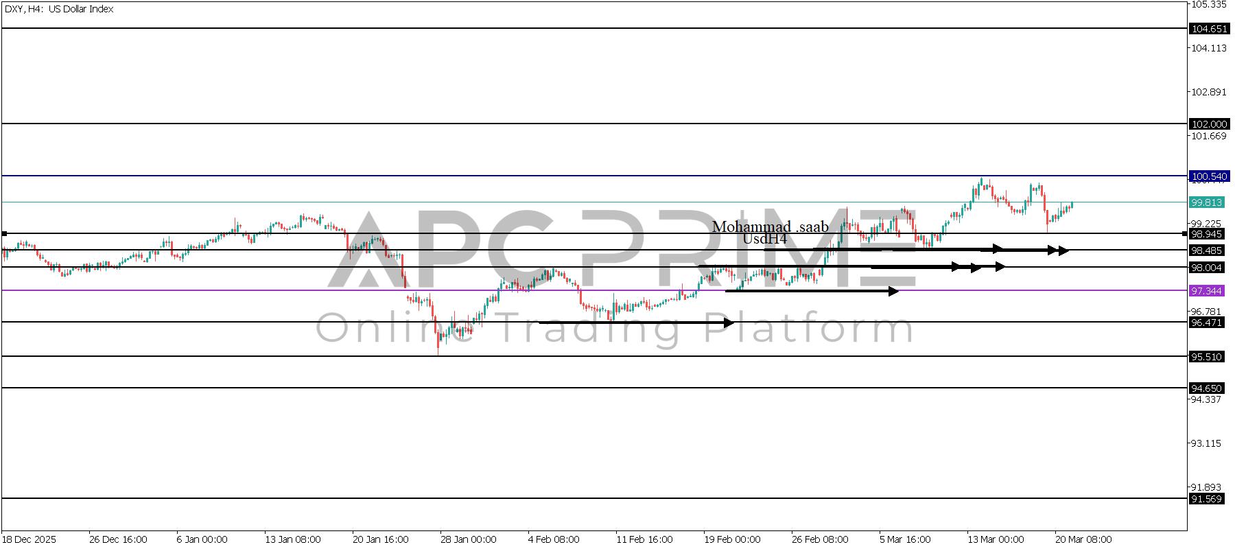 المنطقة الأهم (98.945) ثبات السعر أعلى المنطقة الأهم يتجه السعر إلى منطقة المقاومة (100.540) احتمالية الارتداد منها ممكنة ولكن باختراقها وإغلاق أعلى بشمعة أربع ساعات يتجه السعر إلى منطقة المقاومة (102.000) السيناريو البديل لتحليل مؤشر الدولار